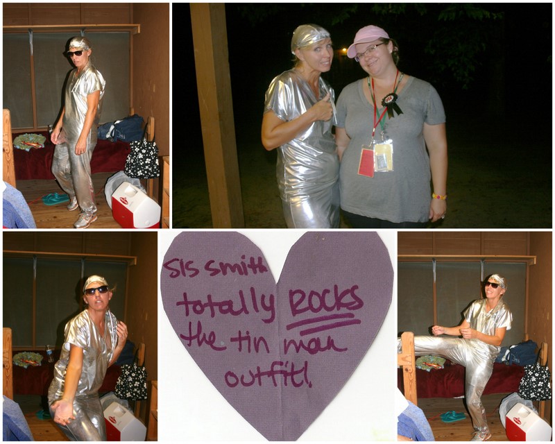 OK, so I had to try on the tinman outfit. It was an old costume that Kathy Cline's daughter wore in a Marching band program.We all got a good laugh out of it. I was running around the camp in it because it just glowed in the dark and looked funny as I raced by. Everyone got a good chuckle out of it,(glad I went poddy before I put it on because I laughed really hard also) but it was hot to wear, so I was glad that the 6th years invited me and my partner in crime into their a/c cabin and gave us popcicles! One of the 5th year girls also gave me this heart. Kathy is now trying to find me one of these outfits from another band parent. This outfit is a must!